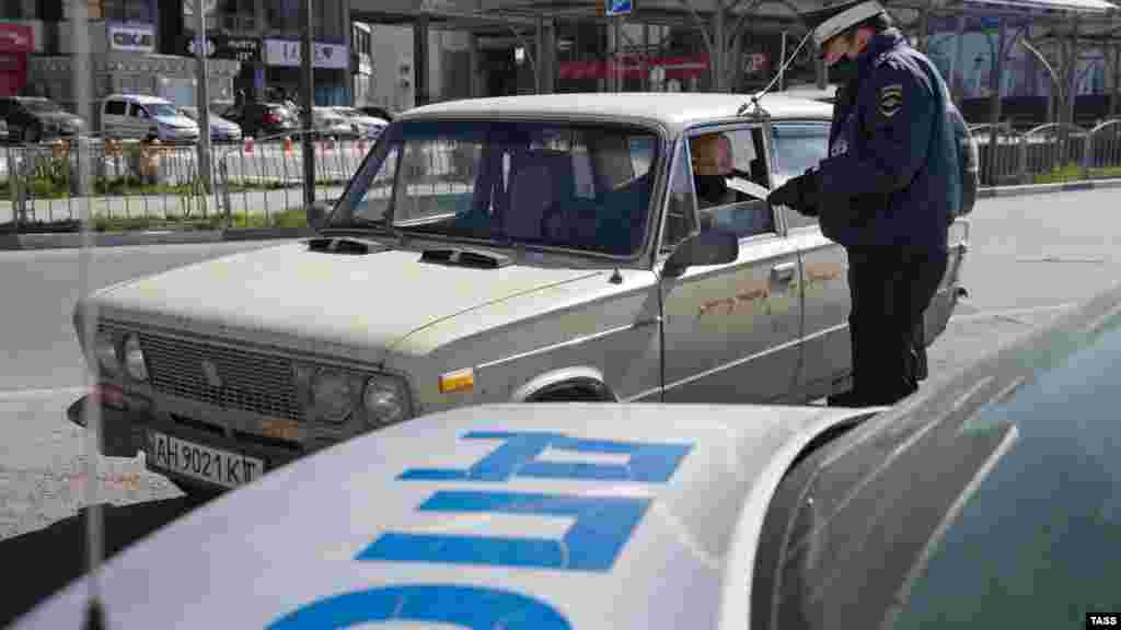Rusiye yol politsiyasınıñ hadimi Aqmescitte Sovetskaya meydanında maşna aydavcısınıñ vesiqalarını teşkere.
