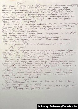 Advokat Nikolay Polozov Aqmescitte yaqalanğan qırımtata rfaali Nariman Celâlnıñ metübini yayınladı. Mektüpte Celâl böyle olacağına azır olğanını yazdı ve halqnı keri çekilmemege ve toqtamamağa çağırdı.