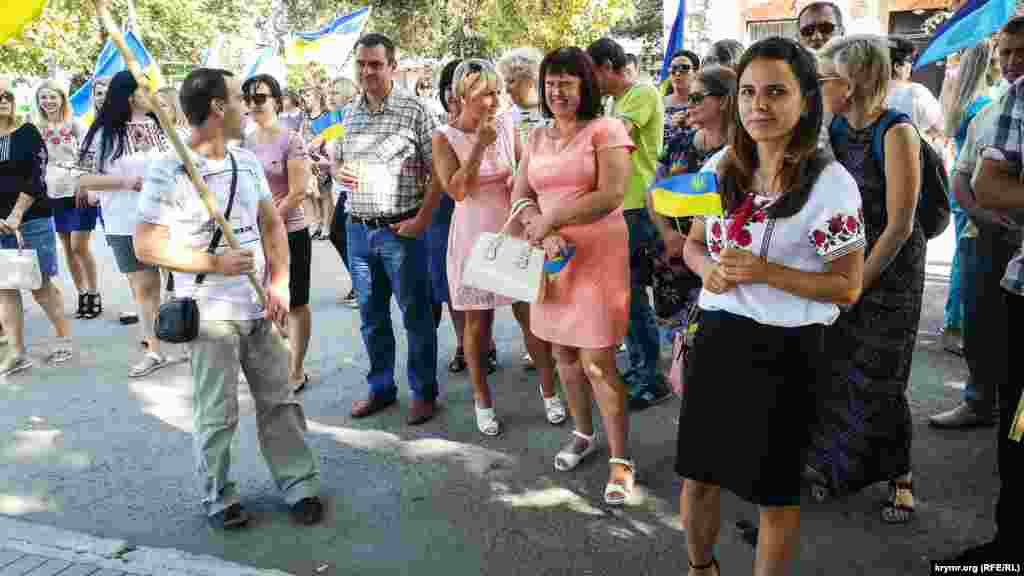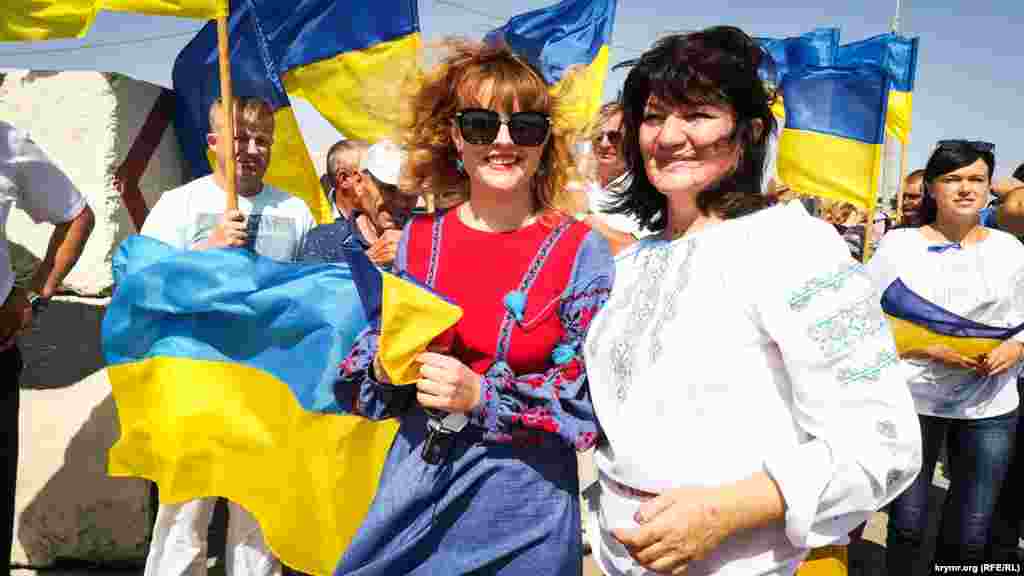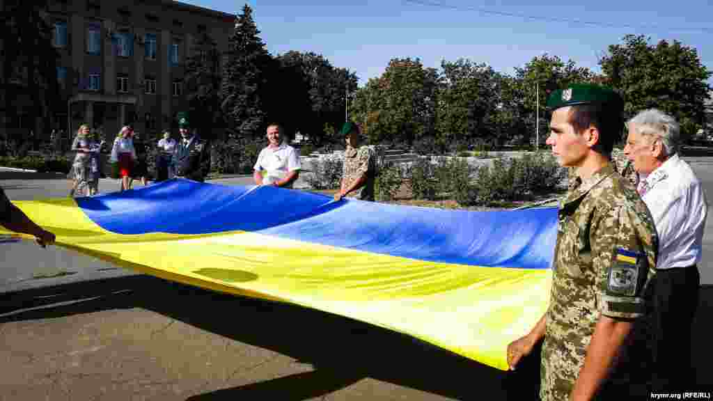 Saba Geniçeskte Ukraina bayraqları ile yürüş yapıldı. Üstlerinde milliy urbalar olğan yürüş iştirakçileri tedbirlerini Geniçesk rayon memuriyeti yanında yekünlediler. O yerde tantanalı surette devlet bayrağı köterildi.