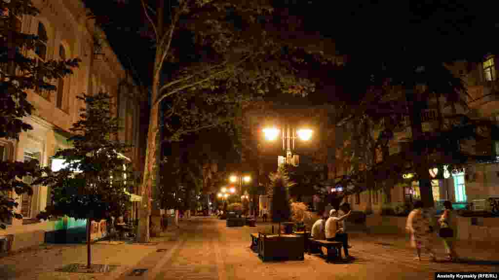 Aqmescitte ağustos künleri toqtamayıp qısqara. 20:00-den soñ qaş qarara. Soqaq fenerleri, reklamalar, vitrinalar, avtomobil fenerleri ve kökniñ bulutsız yüzünde peyda olğan Aynıñ yarığında tanış binalar ve yol kenarındaki terekler adiy sıfatlarını coyalar. Aqşam salqınınıñ tüşmesi ile şeer qalabalığı yerine tınçlıq ve raatlıq keleler.