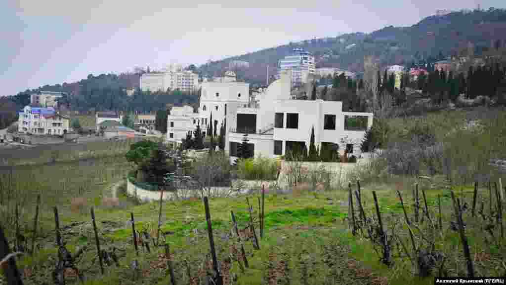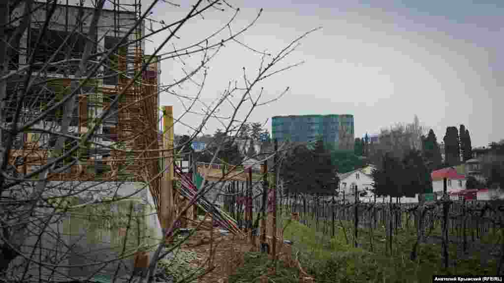 Vinogradnaya soqağında şahsiy evlerniñ qurucılığı. Yeşil qoranıñ arqasında – «Livadiya»nıñ bağları