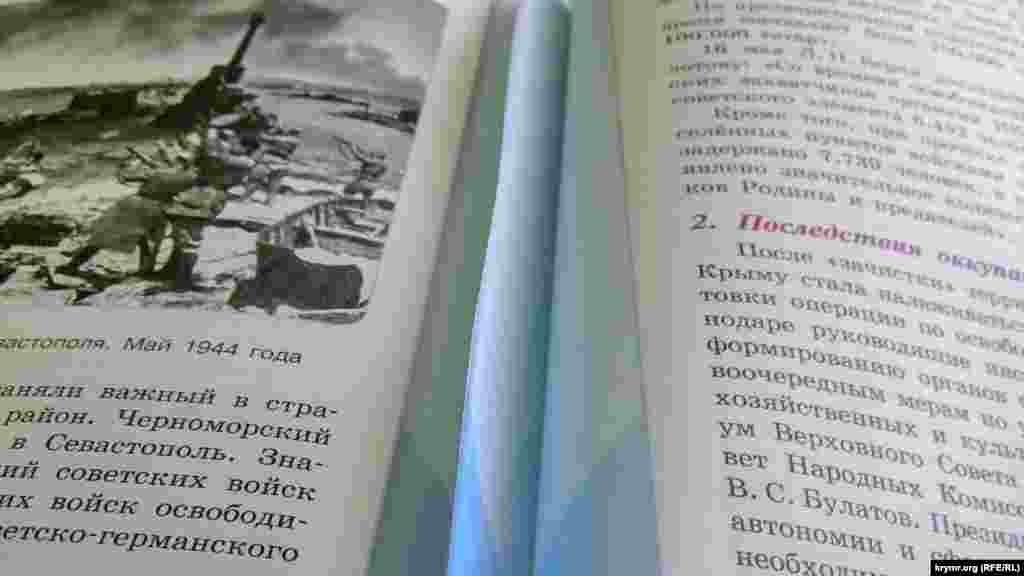 İşğal etilgen Qırım mekteplerine 10-uncı sınıf tarih derslikleri qaytarıldı, anda, aq qorçalayıcılarnıñ fikirince, Ekinci cian cenk vaqtında «işbirlikçi qırımtatarlar» aqqında bapta «qırımtatar halqına qarşı nefret doğurğan» ibareler mevcut edi. Şimdi dersliklerden Ekinci cian cenki vaqtında «tatar ealisiniñ ekseriyeti almanlarğa loyal olıp, bir çoqu olarğa faal yardım etti» degen saifeleri kesilip alındı. Derslikten 6 saife kesildi.